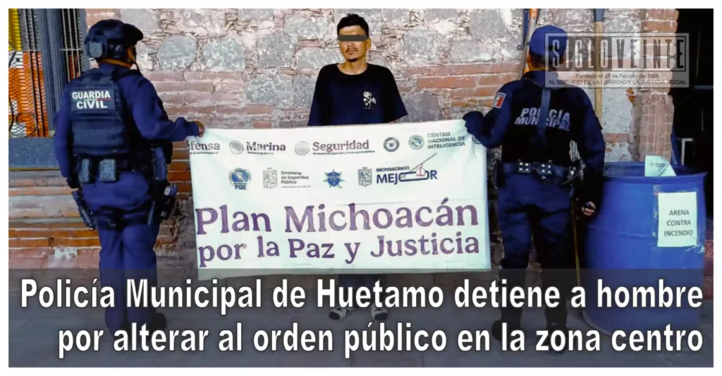 Elementos de la Policía Municipal de Huetamo, en coordinación con personal de la Guardia Civil Estatal Región Huetamo, realizaron la detención de un masculino la tarde de este viernes por conductas que alteraban el orden público en la zona centro de la ciudad.