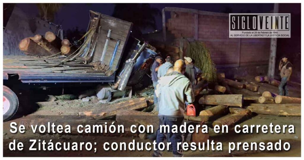 La tarde de este martes se registró la volcadura de un camión cargado con madera sobre la carretera Zitácuaro–Aputzio de Juárez, a la altura de la comunidad de El Aguacate, antes del puente conocido como La Pesca. Elementos del Cuerpo de Bomberos de Zitácuaro acudieron de inmediato al llamado de auxilio.