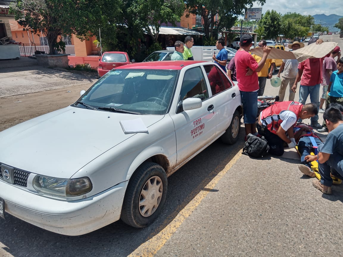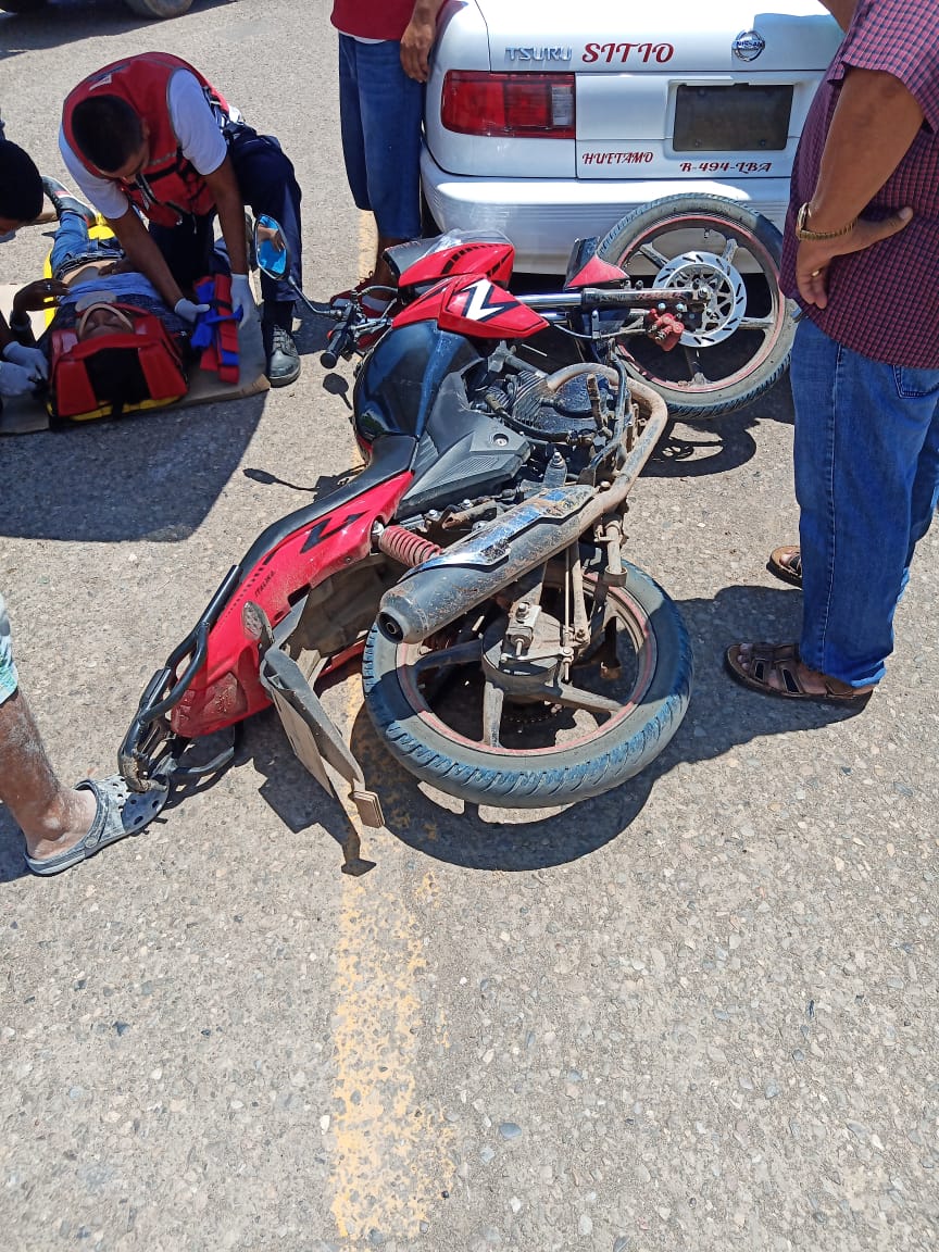 La tarde de ayer jueves, un automóvil del servicio público de taxi chocó por alcance a una motocicleta, resultando con heridas graves el piloto de la moto, hechos ocurridos casi al llegar al entronque de la Avenida Madero Sur con la carretera a Comburindio, frente al restaurante de comida china El Venchy.