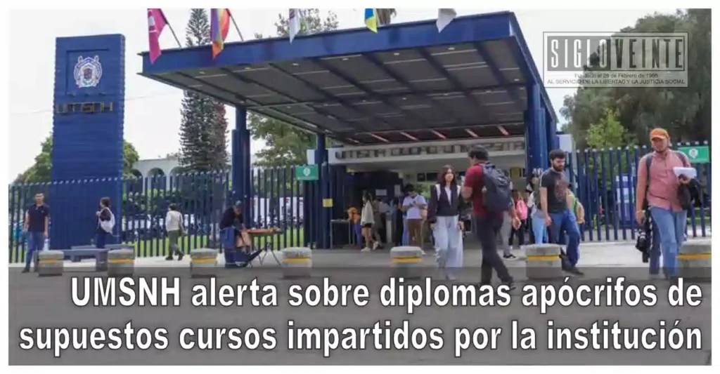 La Universidad Michoacana de San Nicolás de Hidalgo (UMSNH) alerta a la población sobre diplomas apócrifos que se han detectado de supuestos cursos impartidos por la casa de estudios, por lo que exhorta a las personas interesadas en estudiar en alguno de los diplomados de la institución a corroborar la información directamente a través de los medios oficiales o en las oficinas de las dependencias académicas.