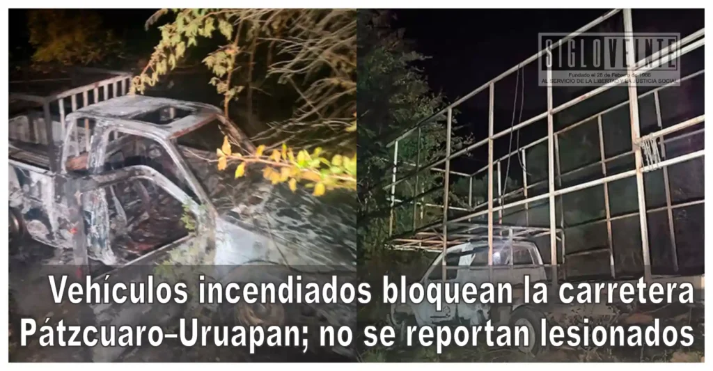 La noche de este miércoles se registró la quema de dos vehículos sobre la carretera libre Pátzcuaro–Uruapan, a la altura del kilómetro 17, en las cercanías de la desviación hacia Zirahuén, hecho que provocó la movilización de corporaciones de seguridad y cuerpos de emergencia.